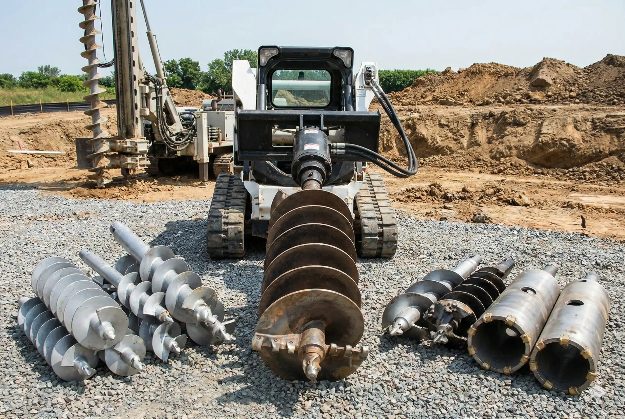 Common equipment includes rotary drilling rigs, CFA rigs, augers, casing tubes, drilling buckets, rock tools, and piling rigs. The equipment depends on soil conditions and project requirements.